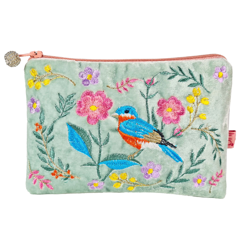 A pretty purse/pouch in mint silk velvet with colourful bird and floral embroidery.