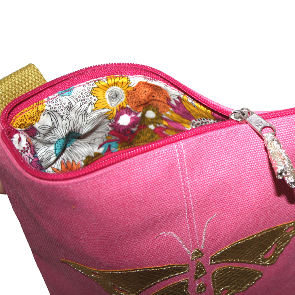 Cross body messenger bag in a bubblegum pink thick cotton canvas with a butterfly appliqued in gold textured faux leather.