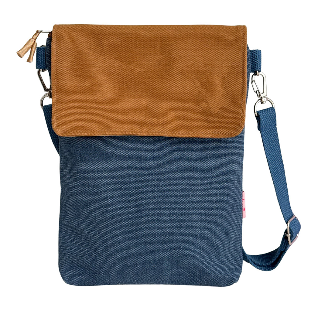 Handy cross body small bag in denim blue canvas and a contrasting cumin canvas flap. Handy for all the essentials.
