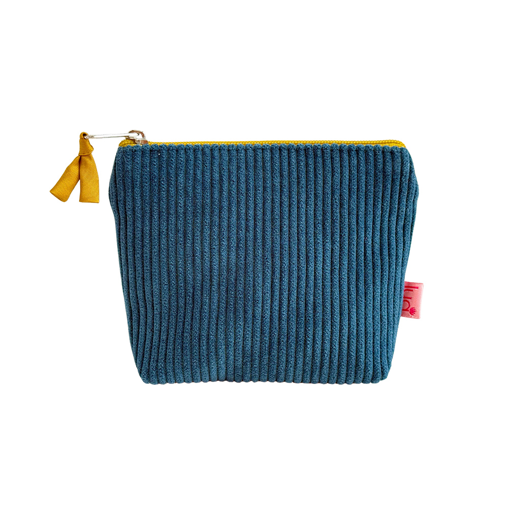 A little zipped purse in teal jumbo velvety corduroy with a contrasting mustard zip.