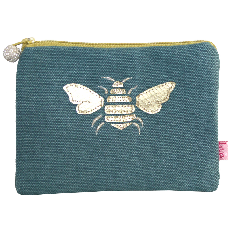 Zipped coin purse in teal cotton mix canvas with a golden hand-appliqued bee in metallic faux leather.