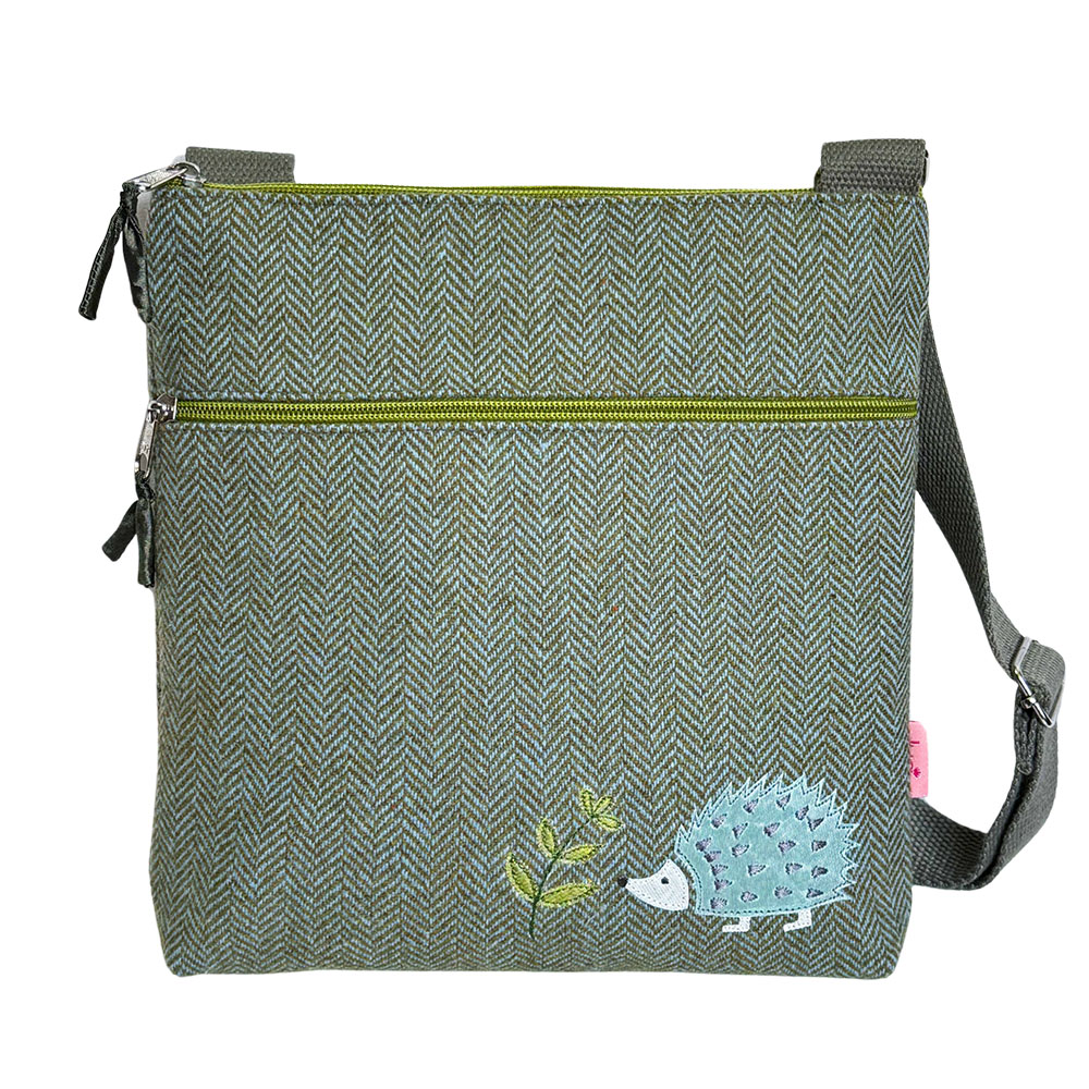 A cross body messenger bag in fern green herringbone tweed with an appliqued/embroidered silky Hedgehog and branch in toning pale blue/green.