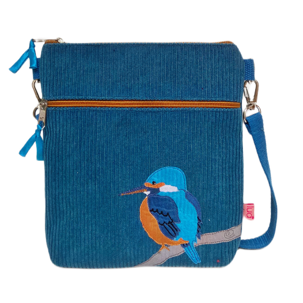 Cross body purse in teal corduroy with a silky appliqued kingfisher on a branch.