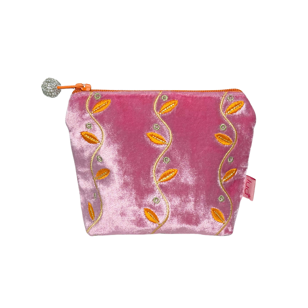 A silk velvet mini zipped purse in a pretty flamingo pink with tiny embroidered tangerine orange leaves.