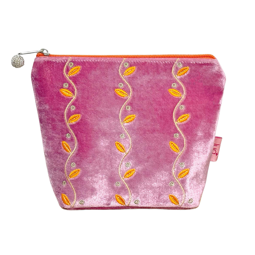 A luxurious silk velvet cosmetic bag for storing cosmetics and other essentials. In a pretty flamingo pink velvet with tiny embroidered tangerine orange leaves.