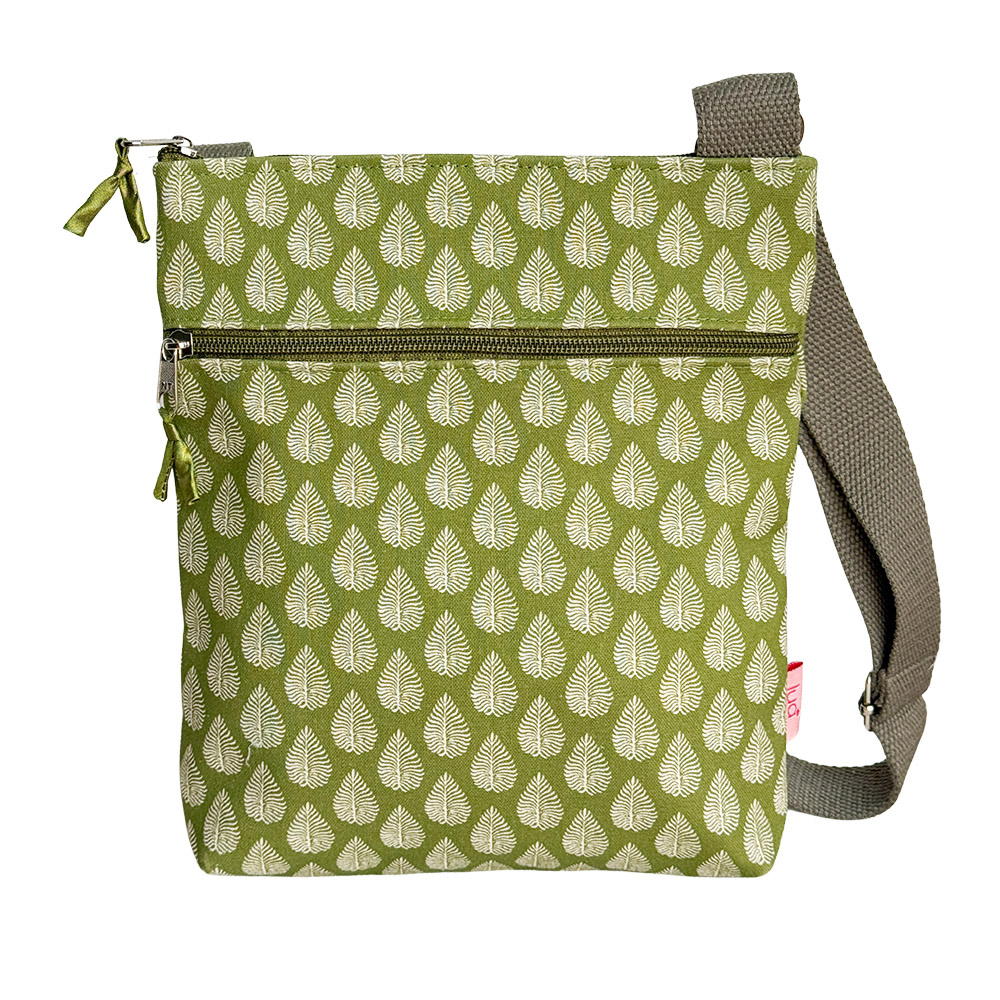 Cross body messenger bag in a small olive leaf cotton print.