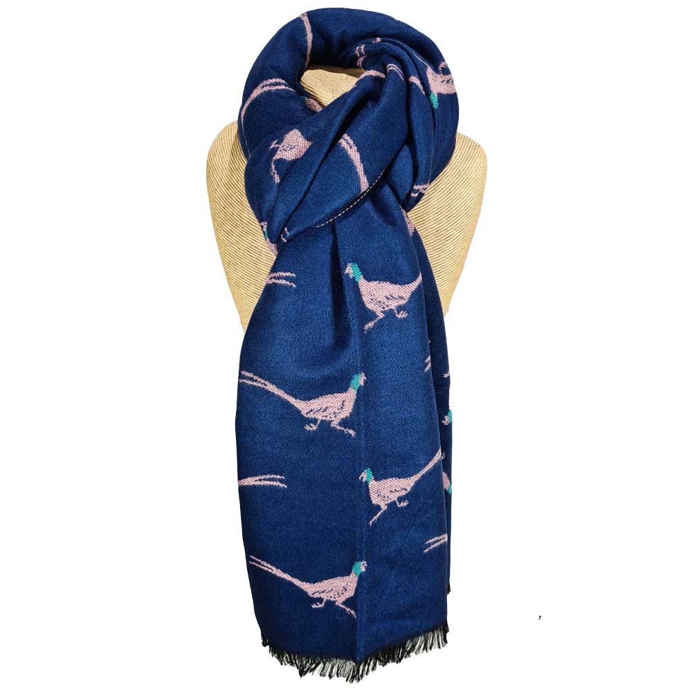 A soft, woven, heavier-weight scarf in a running pheasant design.