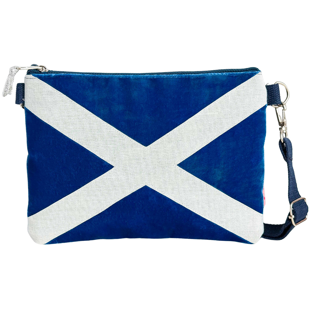 A small cross body bag featuring the Scottish flag in rich azure blue velvet and canvas.
