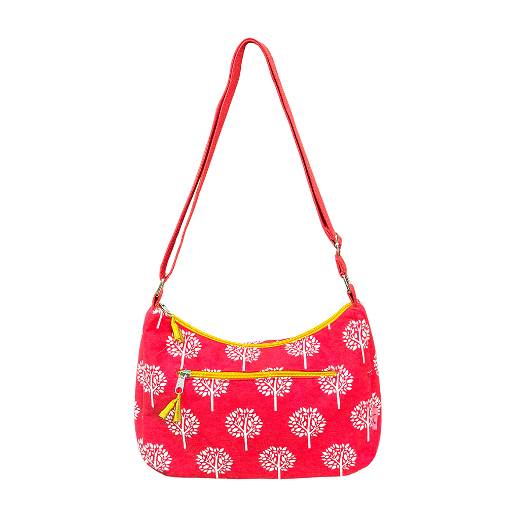 A cute curved cross body bag in a strong Coral Tree print with contrasting Yellow zips.