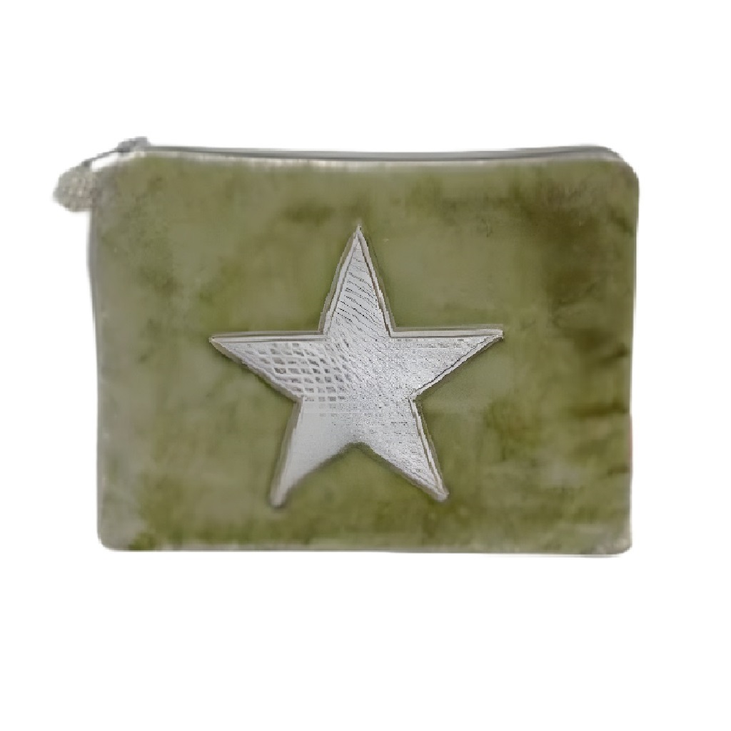 Zipped purse/pouch in fennel green silk velvet with a large silver metallic faux leather star appliqued on the front.