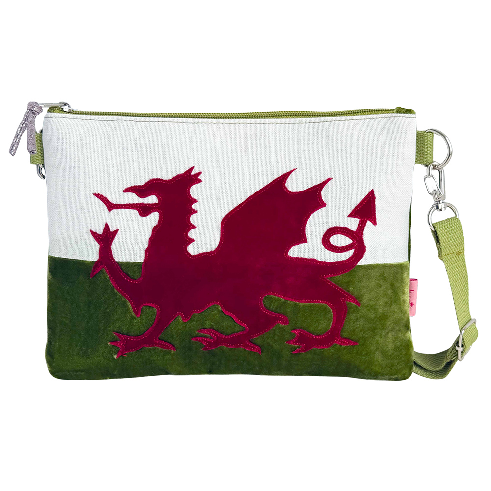 A small handmade cross body bag featuring the Welsh flag in rich olive and red velvets and canvas.